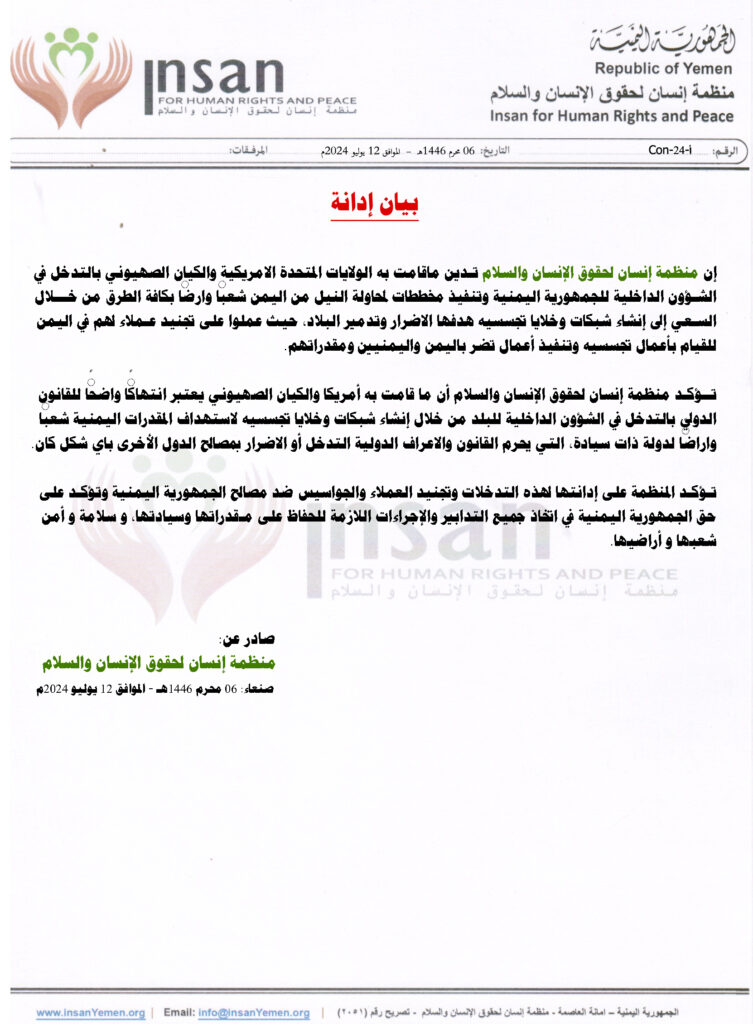 تــؤكـد منظمة إنسان لحقوق الإنسان والسلام أن ما قامت به أمريكا والكيان الصهيوني يعتبر انتهاكاً واضحاً للقانون الدولي بالتدخل في الشؤون الداخلية للبلد من خلال إنشاء شبكات وخلايا تجسسيه لاستهداف المقدرات اليمنية شعباً واراضاً لدولة ذات سيادة، التي يحرم القانون والاعراف الدولية التدخل أو الاضرار بمصالح الدول الأخرى باي شكل كان.